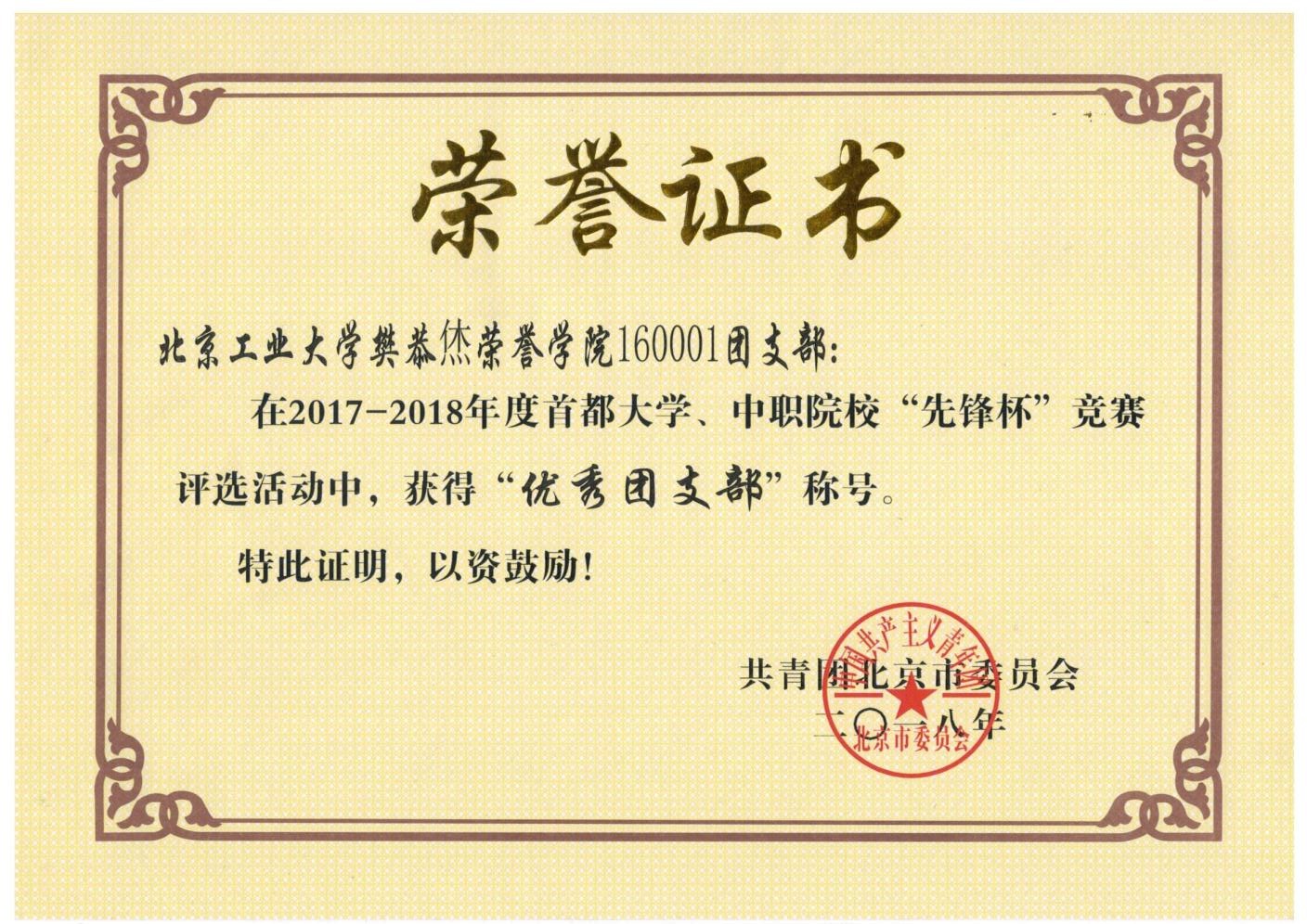 160001 团支部 荣获 先锋杯 优秀团支部