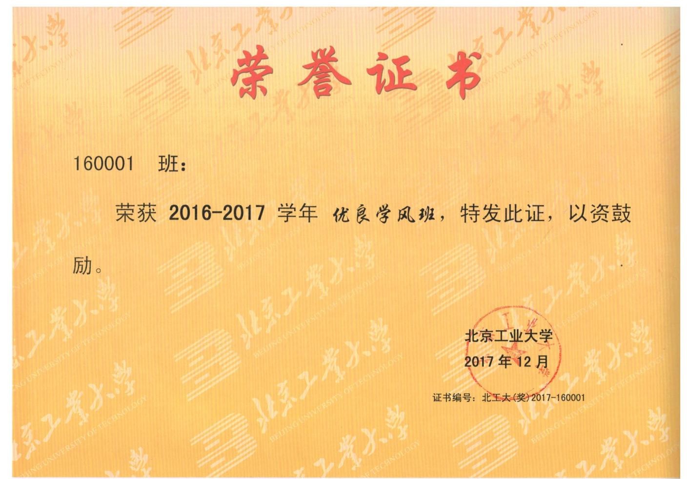 160001班 荣获 优良学风班