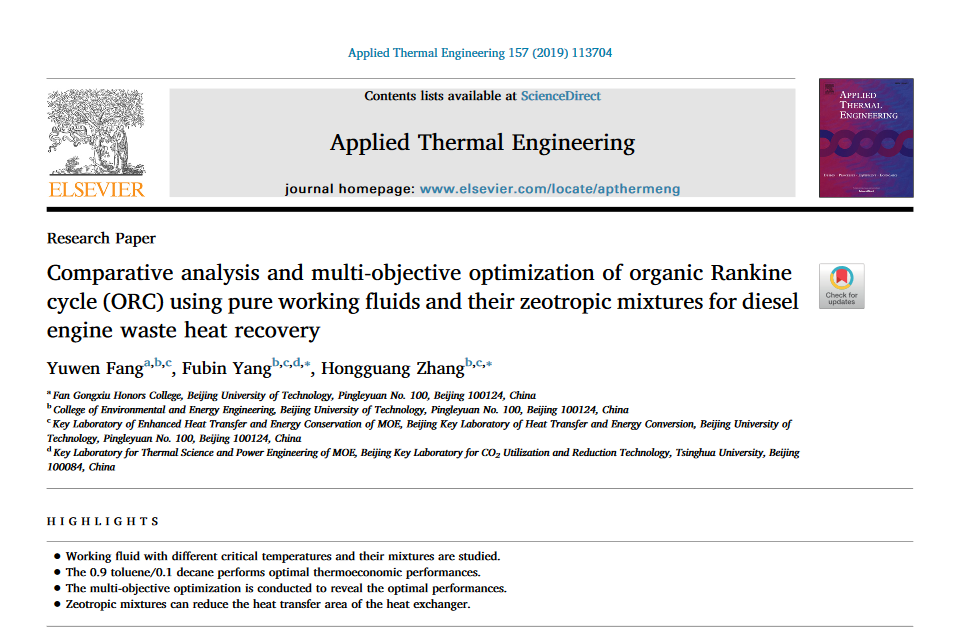 2015级本科生方钰文同学(能源与动力工程专业)以第一作者身份在SCI期刊《Applied Thermal Engineering》(JCR Q1,影响因子3.771,CiteScore 4.14,工程大类2区)上发表了题为Comparative analysis and multi-objective optimization of organic Rankine cycle (ORC) using pure working fluids and their zeotropic mixtures for diesel engine waste heat recovery的学术论文。《Applied Thermal Engineering》是热力工程领域影响力较高的权威学术期刊之一,主要关注能源生产、存储、利用以及节能等热过程所涉及的装备、技术方面的创新研究。该论文为我院本科生首次以第一作者身份在SCI期刊上发表的学术论文。