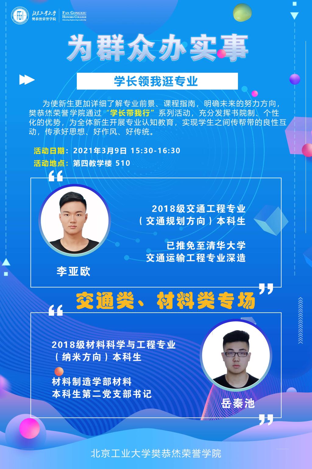 应学生实际需求,计划开展系列专业介绍活动。2021年03月09日,学院在第四教学楼组织开展“交通类、材料类专业学长领我逛专业”专场活动。