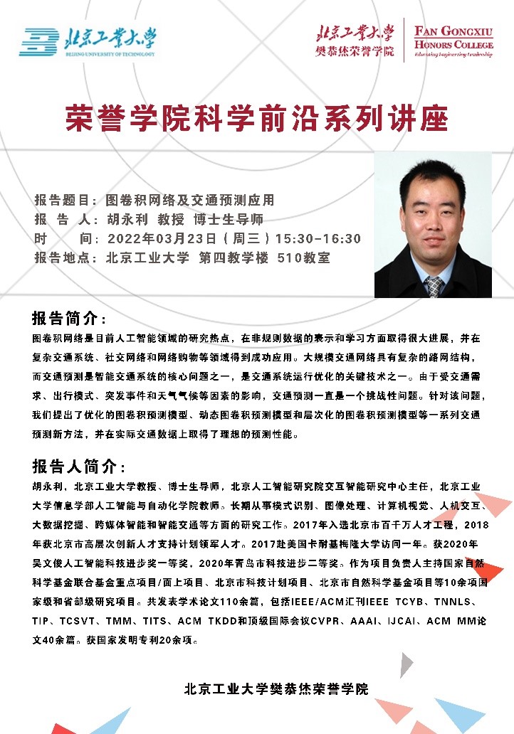信息学部人工智能与自动化学院胡永利教授,开展了主题为图卷积网络及交通预测应用的报告。