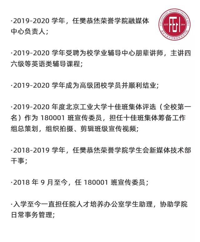 在每项工作、在每一个工作现场,我作为协调者和负责人,也是整个部门的润滑剂,在面对不同专业不同部门的同学时,保证成员之间的合作沟通的顺畅无阻,充分发挥各自优势,完美地完成每一项工作。在2020年十佳班集体评选活动中,我们并肩作战,在经历了多少个漫长的夜晚后,我们制作并呈现出了精美优质的评选视频,征服了十佳班集体评选的所有评委老师,最终以北京市第一名的成绩获得了北京市十佳班集体荣誉称号。