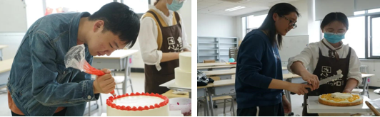 在圆圆的蛋糕工作台上,美食与艺术的碰撞拉开了序幕。同学们切水果、打奶油,一层层均匀放置、涂抹在蛋糕上。一开始,不少同学担心自己动手能力不足,但在专业人员的耐心讲解后,学习能力不俗的同学们便跃跃欲试了起来,都踊跃地参与了蛋糕的制作。在将蛋糕覆盖上一整层奶油后,同学们也展开丰富的想象力对蛋糕进行了装饰。在欢声笑语中,一个双层蛋糕和一个大蛋糕制作完成。