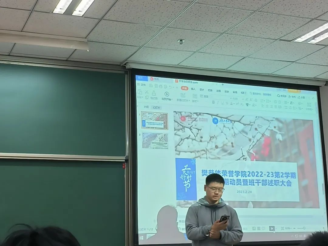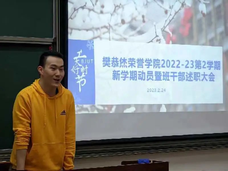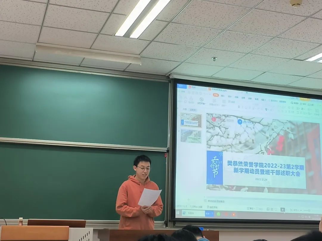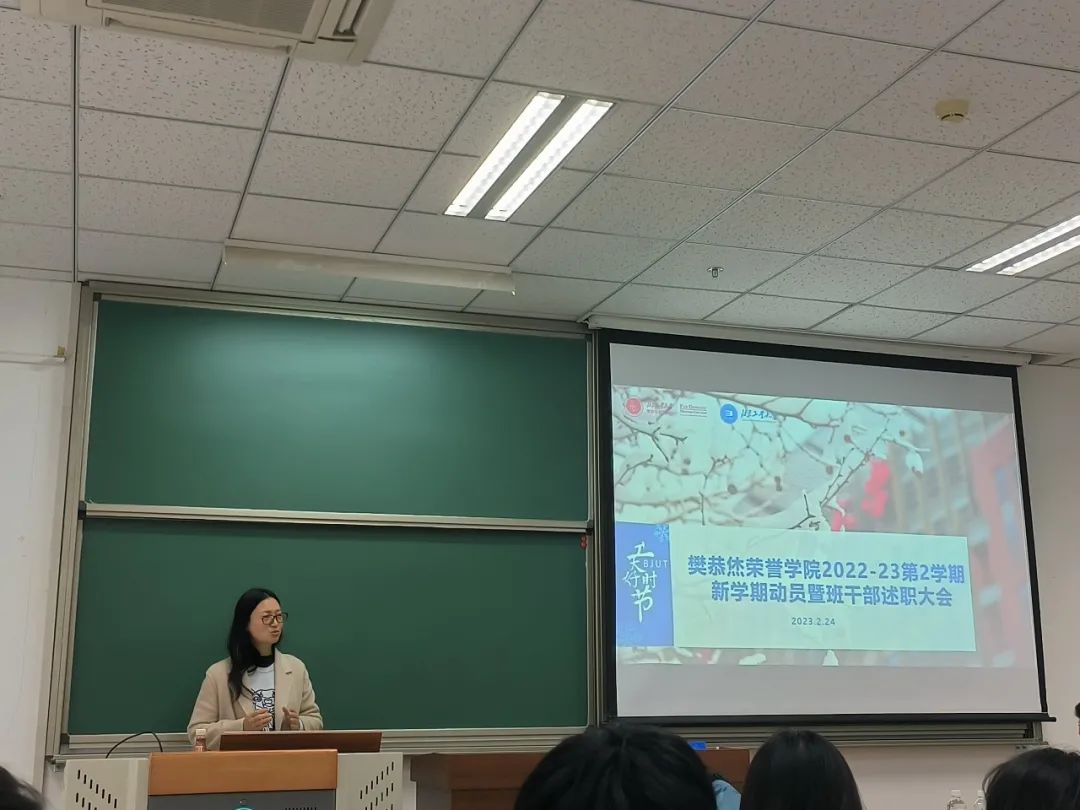 两位老师发言结束后,各位班干部陆续上台做述职报告,总结了在过去一个学期中的各项工作,并且借此机会进行自我反思,对新的一个学期的工作开展规划进行了汇报。两个班级的团支书首先概括了上学期开展的团日活动,并呼吁大家积极参加社会活动和团支部建设,随后班长们总结了过去半年学生工作的亮点和不足并详细阐述了新学期工作将如何开展。组织委员、宣传委员计划开展独具班级特色的活动和宣传工作,为新学期绘制了美好的蓝图,三位文体委员也表示会在新学期组织开展各种各样的文娱活动,为同学们的课余时间增添趣味。他们都提到,多亏每一位同学的积极配合,干部工作开展起来省去了不少麻烦,并且在新学期中,班干部与同学们要共同努力,共同进步。