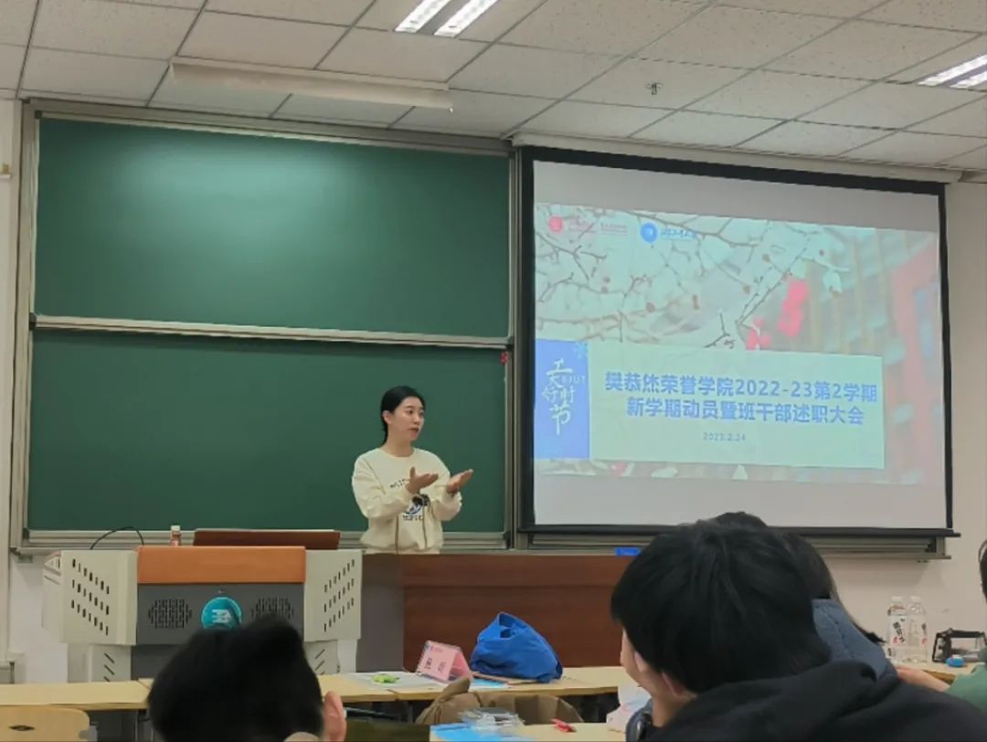 副院长袁莉敏老师为本次活动致辞,首先做出了对于上一个学期的总结和对同学们的本学期各方面的殷切希望,以“新”为基调,在“新”学期以“新”形式,开展“新”活动,展现“新”风采。接着,袁老师结合自身求学经历和樊院往届的学长学姐的经历,给同学指点迷津,以学习为主要目标,继续打造樊院学子的独特名牌。她提出在新的一个学期中,各位同学要总结上个学期遇到的挫折的,认真反思并且积累经验,争取在新学期中取得更优异的成绩。
