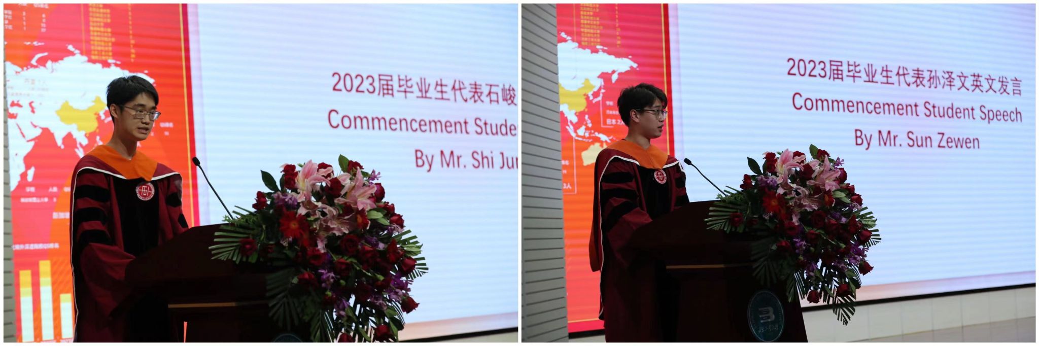 2023届毕业生代表石峻、孙泽文同学中英文发言中以真情实感,回溯了大学四年来190001班的点点滴滴,一位位可敬而可爱的老师们的悉心教导、每一次活动的拼搏与欢笑、每一场答辩的紧张与期待,都是同学们最宝贵的回忆。同时也给予了大家最美好的憧憬与祝愿,他们与大家约定,未来在不同的领域继续耕耘,共同朝着工程领域领军人才的目标进发,待春华秋实之际,再度相会。