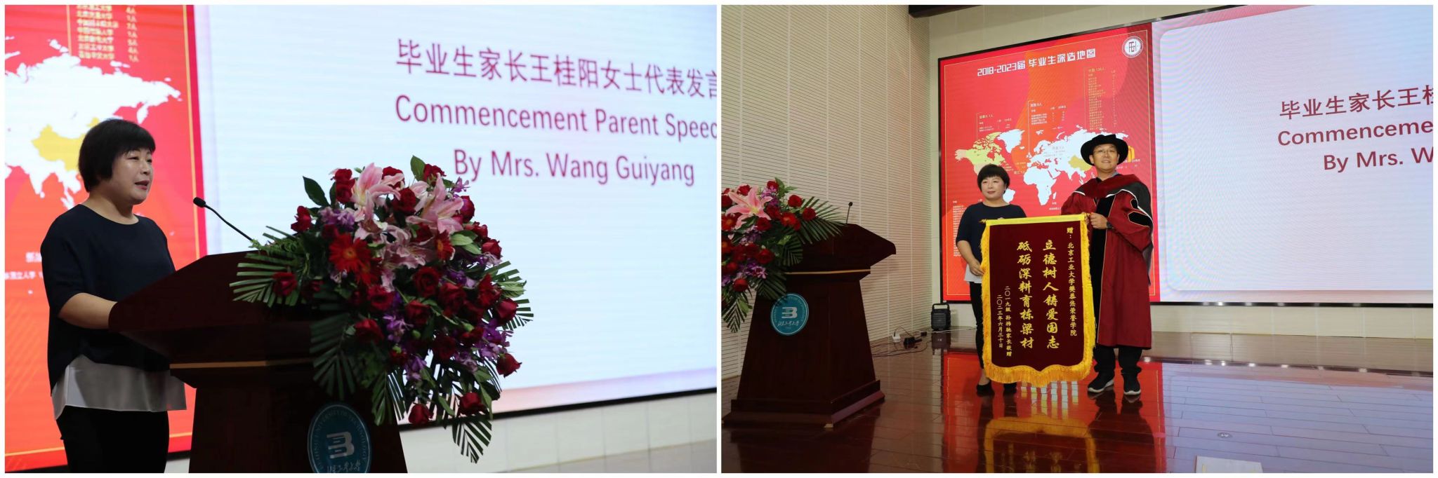 随后毕业生家长代表王桂阳女士发言,她从一位陪伴者、长辈的关怀出发,勉励大家坚定自己的选择与信念,争做时代的弄潮儿。最后也为大家赠言践行,“任重道远需策马,风正潮平好扬帆”,希望大家保持永不服输、永不言败的精神,在国家发展、民族复兴、人类进步的历史进程中贡献青春力量,在最好的时代成就最精彩的人生。王桂阳女士还作为家长代表为学院赠送锦旗,感谢四年来学院对同学们的爱心栽培。
