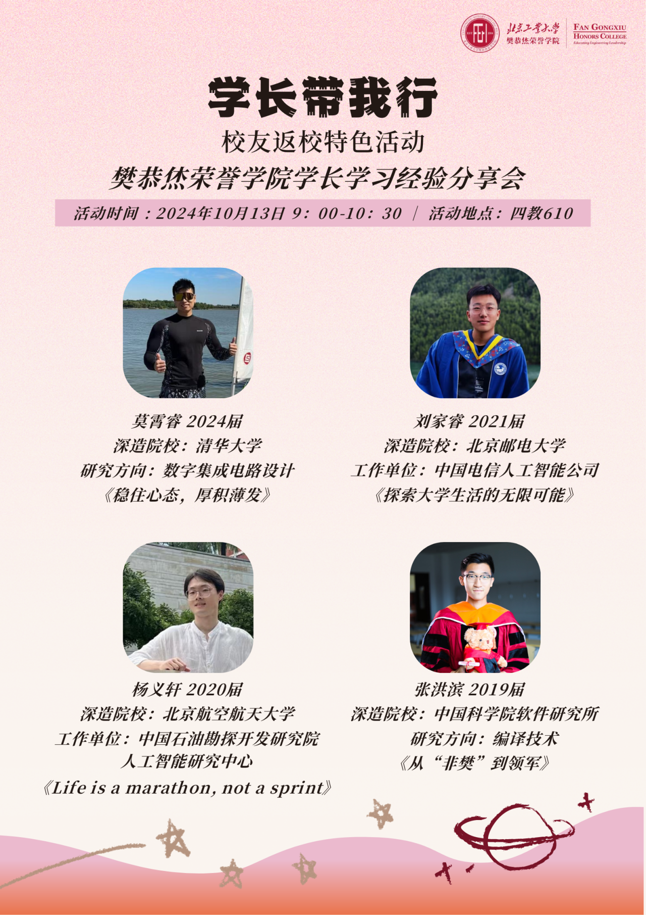 在经验分享环节,几位杰出校友分享了他们的宝贵经验和心得。莫霄睿学长从心态与积累的角度出发,建议学弟学妹们保持稳定的心态,注重积累,为未来的突破打下坚实的基础。刘家睿学长则鼓励同学们勇于探索大学生活的无限可能,在自己的热爱领域中不断追求卓越。张洪滨学长分享了他从“非樊”到领军的成长历程,特别是他创立的Buddy Compiler开源社区的经历。杨义轩学长则用“Life is a marathon, not a sprint”来勉励同学们坚持自己的热爱,保持耐心,最终将见证丰硕的成果。