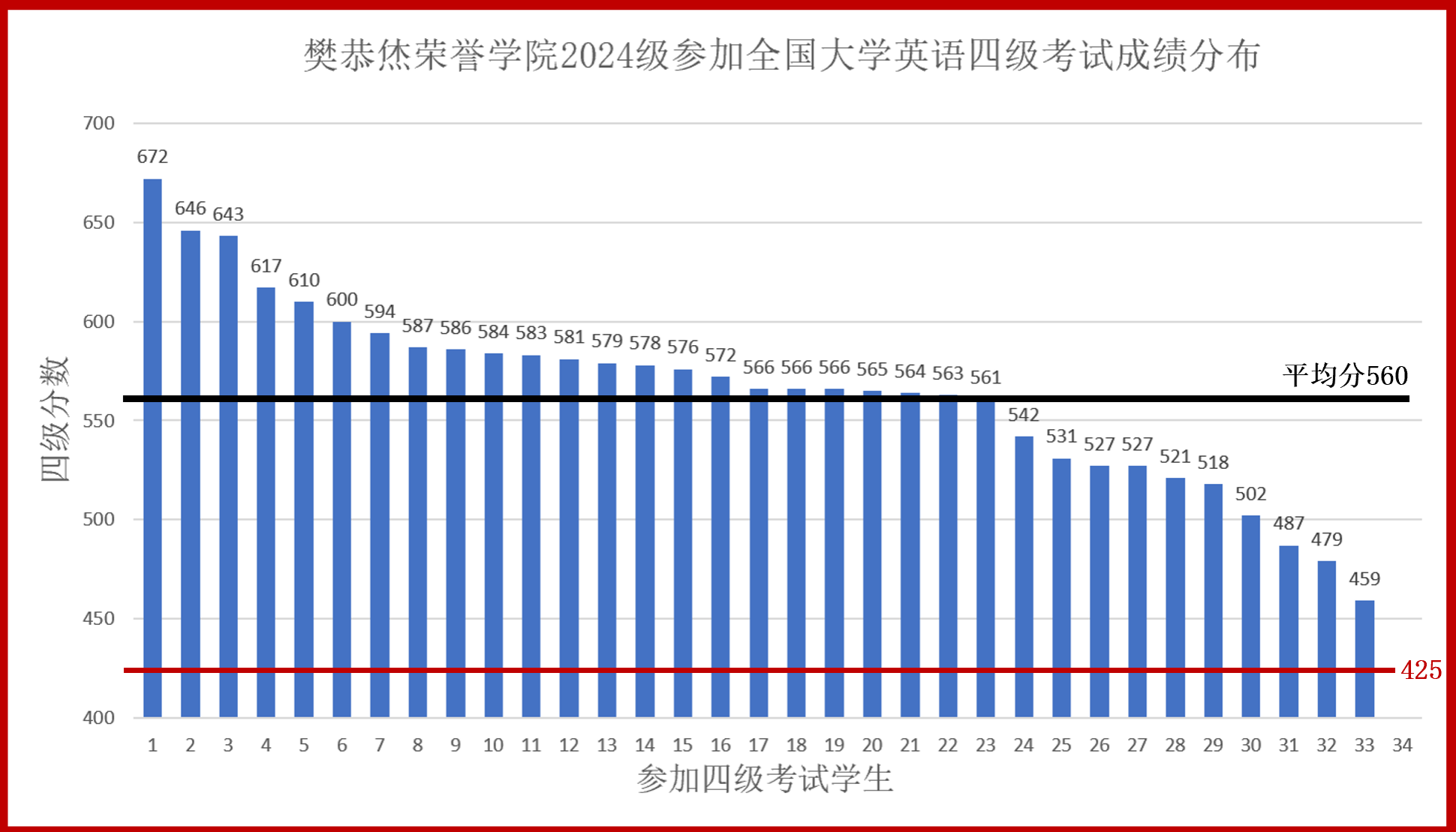 2023级和2024级学子们再次交出了一份令人瞩目的成绩单。2023级学生迄今为止,四级通过率达到了100%,平均分561.95分;六级通过率达到了70%,平均分541.53分,其中范文翰同学六级成绩高达661分。2024级学生参加四级考试的34人,通过率高达97%,平均分560.00分。这些优异的成绩背后,是樊院学子的勤奋努力,更是学院独特培养模式的有力见证。