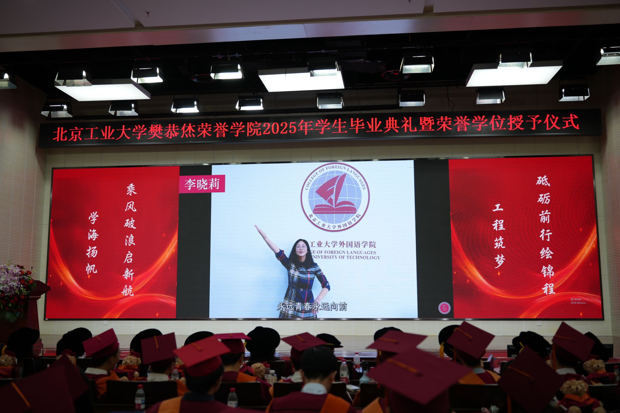 校歌《明天》响起,2025届毕业生们缓步走上舞台,齐聚聚光灯下,共同唱响这首属于青春的乐章。此刻,毕业的喜悦与对未来的憧憬、不舍与留恋交织在每个人心中,化作久久不散的情感涟漪。仿佛希望这一刻能够被定格,恒久绵延,奔赴未来,也铭记此刻。