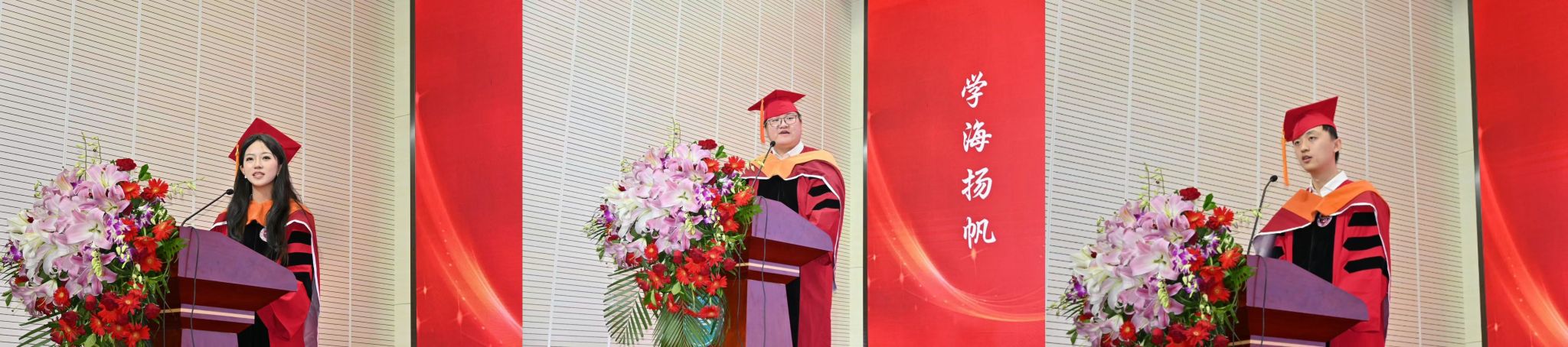 2025届毕业生代表张莅凝、员钰彬、齐骥同学以中英文发言的形式,倾情讲述了属于这一届樊院人的青春故事。他们回顾了四年间在荣誉教育体系下的成长与蜕变,从实验室的思辨探索,到国际交流中的视野拓展;从学生组织中的协同奉献,到个体选择中的勇敢求索。他们的发言展现了“荣誉”二字背后沉淀的判断力、责任感与温度,也映照出这一届毕业生多元而坚定的精神风貌。无论是科研尖兵,还是生活中的普通一员,每一位同学都在用自己的方式回应时代的召唤。三位同学用真挚的语言,记录了这一代“樊院人”的独特记忆与价值信仰,也将这份属于青春的勇气与信念,传递给在场的每一个人。