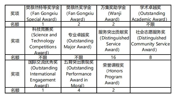 本科生:学习优秀奖、优秀学生干部、创新创业奖、三好学生、励志奖、先进班集体、优秀团支部、标兵团支部;